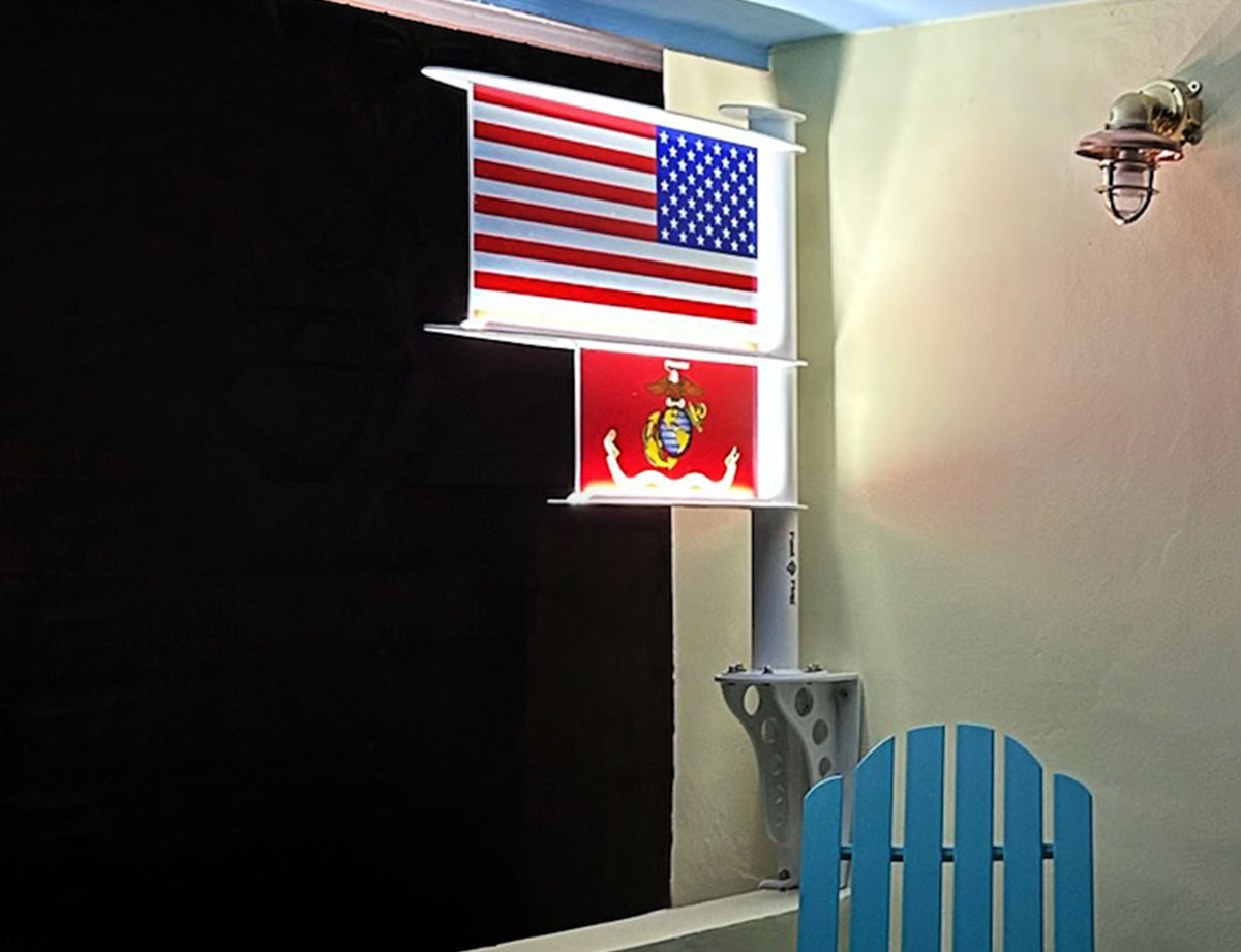 The 30” Solid American Flag / 20” Solid State/Military Flag is cut out of one sheet of aluminum that is powder coated to withstand the rigors of the marine environment. These flags are permanently mounted to a 90-degree mast ideally suited for a prominent entry location along the water’s edge or upland side entrance from the street. Rain or shine, wind or no wind, these flags stand tall and show off their true colors’ day or night. The 30” flag is wrapped with a red, white & blue stars and stripes vinyl applique or custom design and the 20″ flag is a solid State or Military flag.